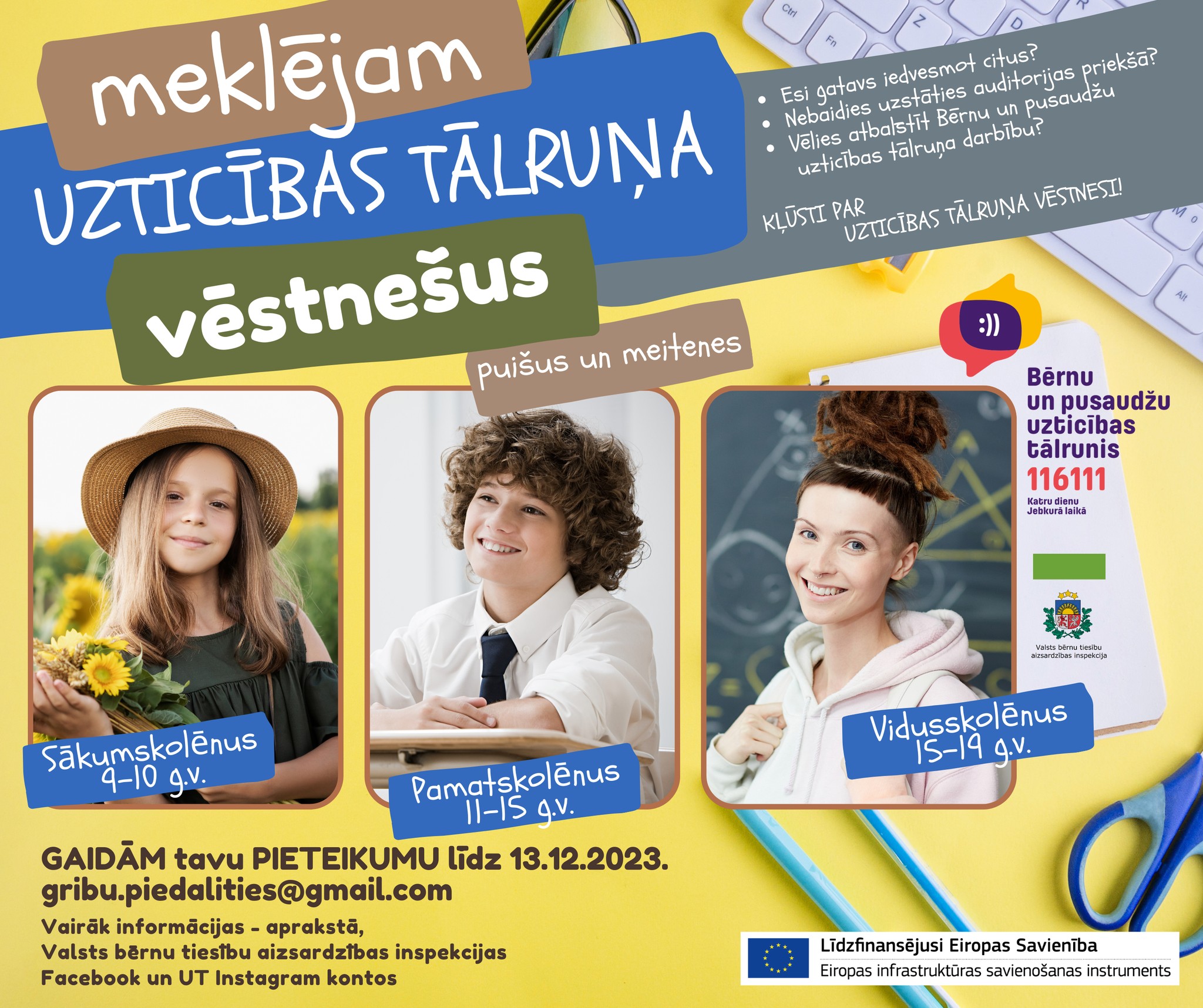 Valsts bērnu tiesību aizsardzības inspekcija izsludina aicinājumu bērniem un pusaudžiem kļūt par UZTICĪBAS TĀLRUŅA VĒSTNEŠIEM un iedvesmot citus bērnus un pusaudžus!